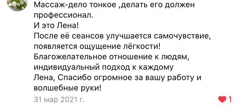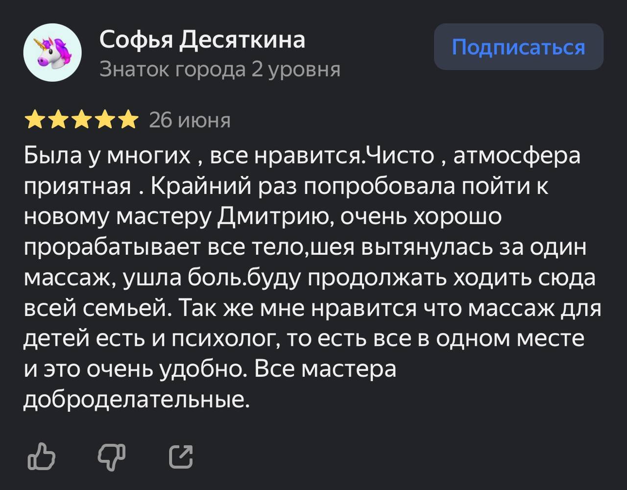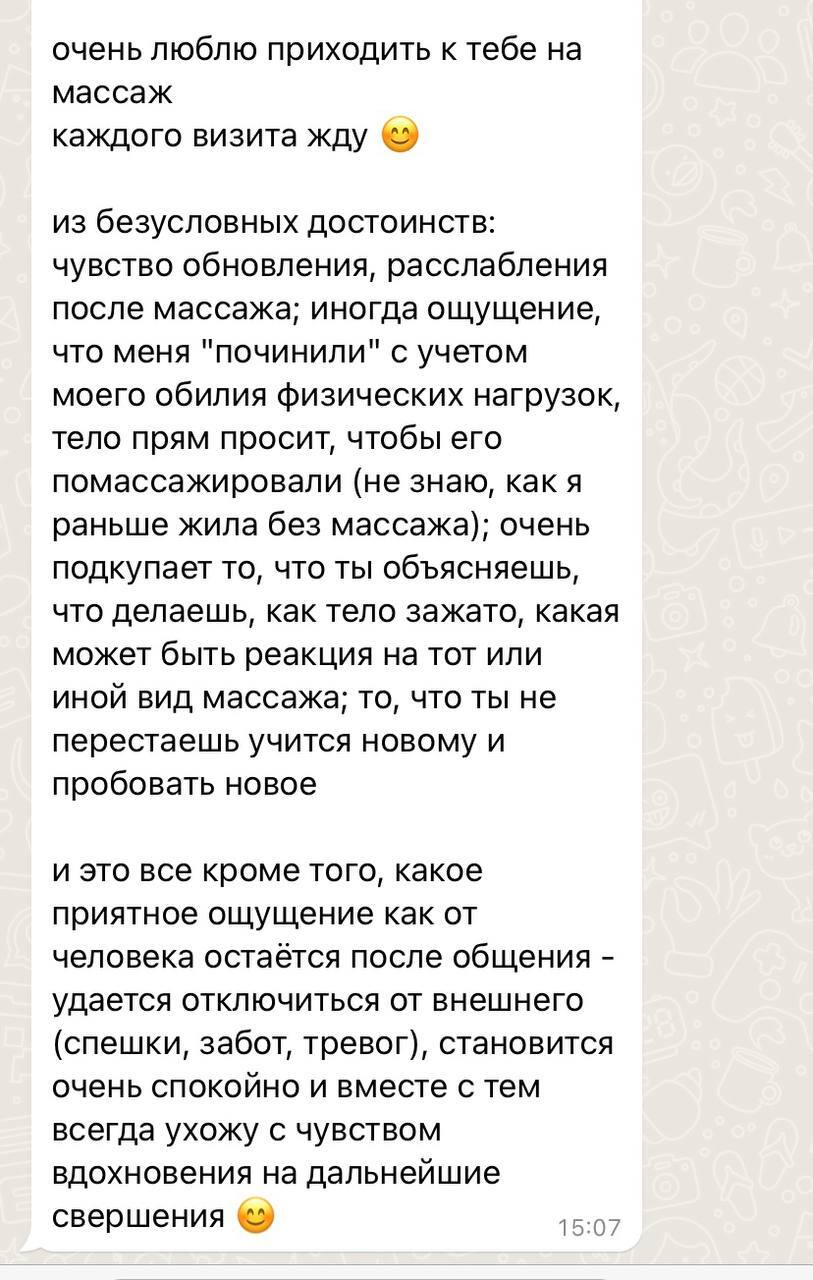 с 2013 года изучаю красоту и гармонию тела, постоянно совершенствую свои навыки и знания. Я искренне желаю и способна помочь людям улучшить качество своего тела и жизни. Встреча со мной и моими коллегами - это не просто массаж, это удивительное путешествие к самому себе, красоте и гармонии