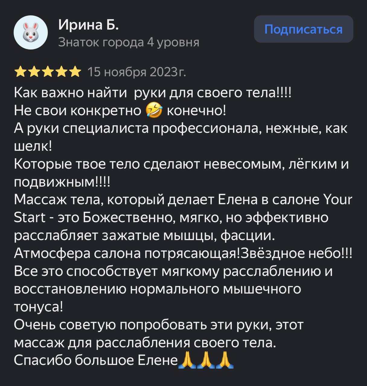 Философия Your Start — помочь вам услышать своё тело и душу, научиться понимать, чего вы действительно хотите, и восстановить связь с самим собой. Через массаж мы не просто снимаем напряжение, мы помогаем включить парасимпатическую нервную систему — ту, что отвечает за расслабление и восстановление. Это путь к свободе быть собой, к внутреннему счастью и гармонии. Только из состояния единения с собой, расслабления и осознанного чувства своего тела мы способны по-настоящему отдавать и заботиться о других.